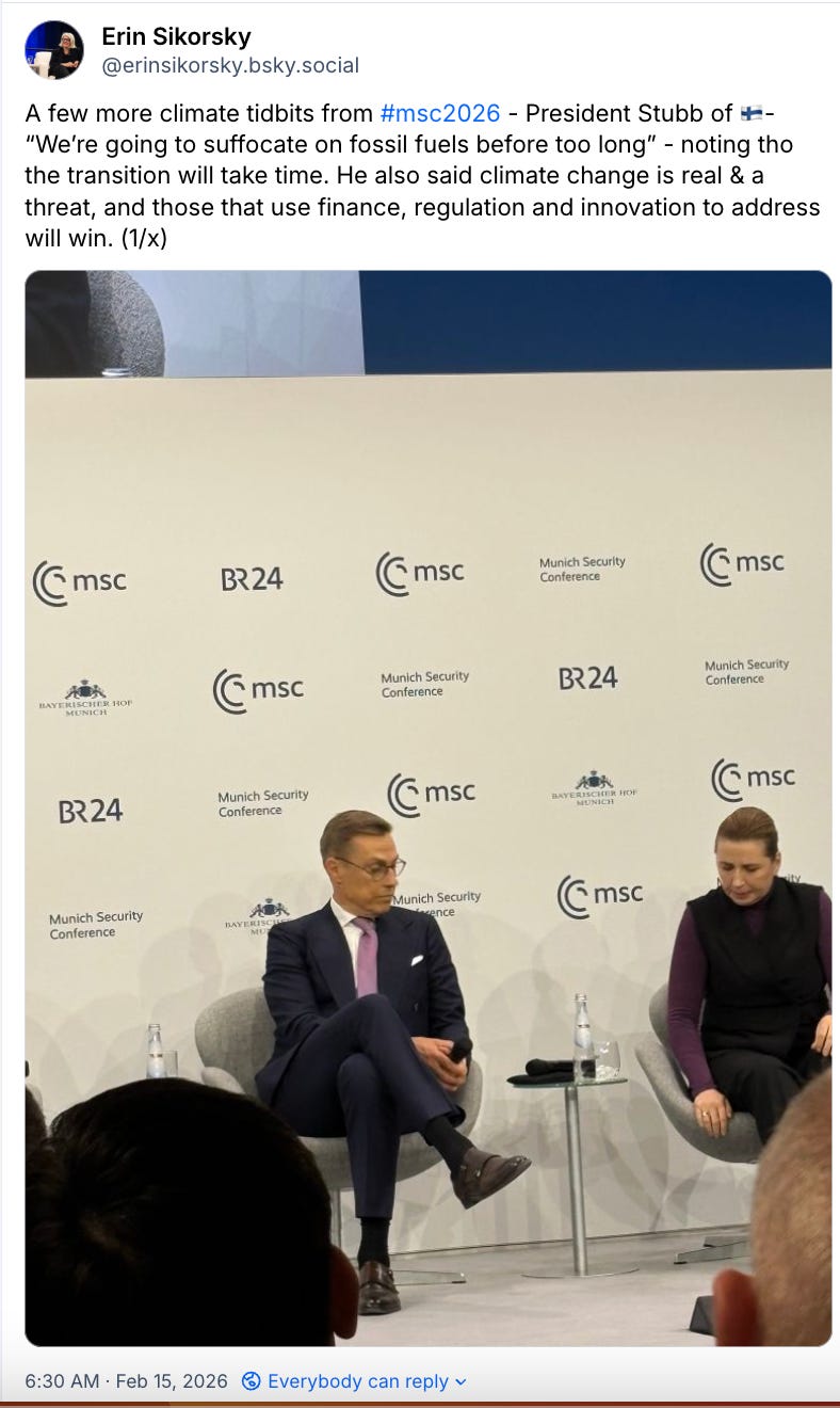 Let’s get the bad out of the way first. While far from the most odious part of US Secretary of State Marco Rubio’s mainstage speech, his warning about the “climate cult” was as disheartening as it was unsurprising. In a late night session I attended, US Ambassador to NATO Whitaker said he wouldn’t call himself a climate denier–”especially among this crowd”–but he was a climate skeptic. Not sure I see a material difference. At this point, I’m quite sure all US Administration officials have a checklist of references they must make in their speeches, and disparaging climate action is at the top.